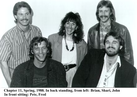 Chapter 11 began playing for the public in the late summer of 1987, and enjoyed almost immediate success. A truly crowning moment occurred in the winter of '87 when Chapter 11 won the Battle of the Bands at the Bank Saloon in Boulder. Dad recalls a dozen or so bands local to the Denver-Boulder area participating. Each band played 15-30 minute sets over the course of Friday and Saturday night, with the two finalists each playing an additional 20 minutes at the end of Saturday night. When it was over Chapter 11 was voted the winner hands down! This was especially gratifying for 'ole Daddyo because the runner-up band turned out to be none other than that group that fired pops several years ago (the very first band Dad joined) for not relenting to growing his hair long and dressing to their whimsical specifications!